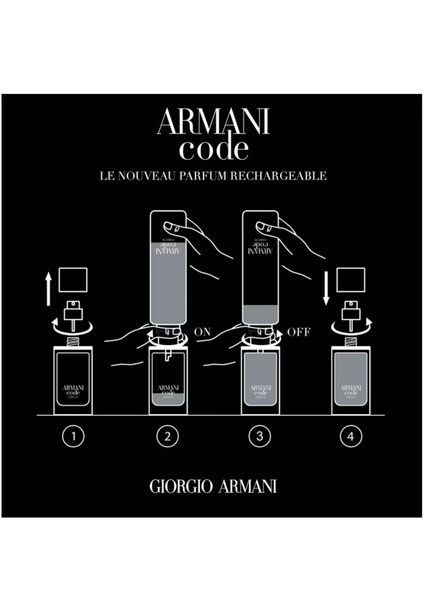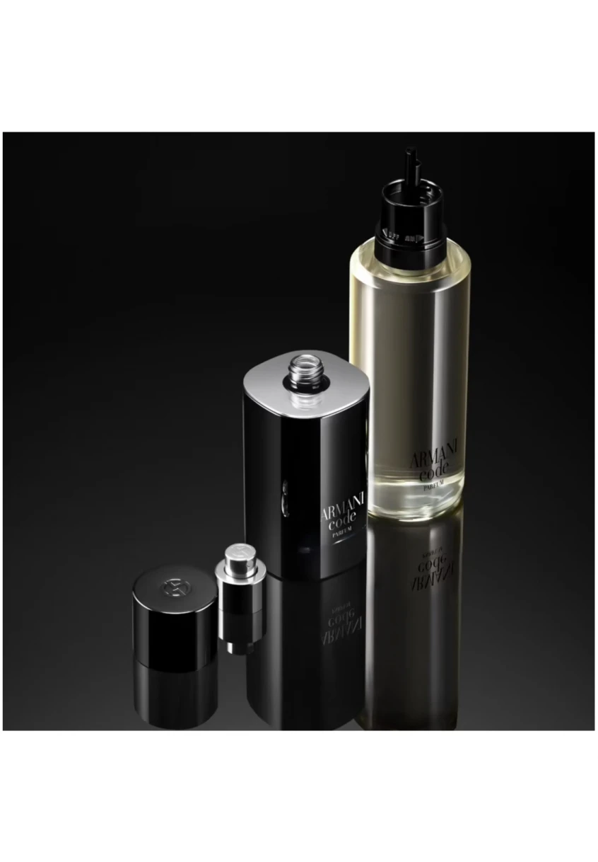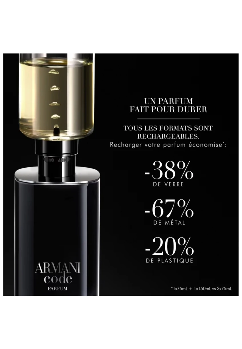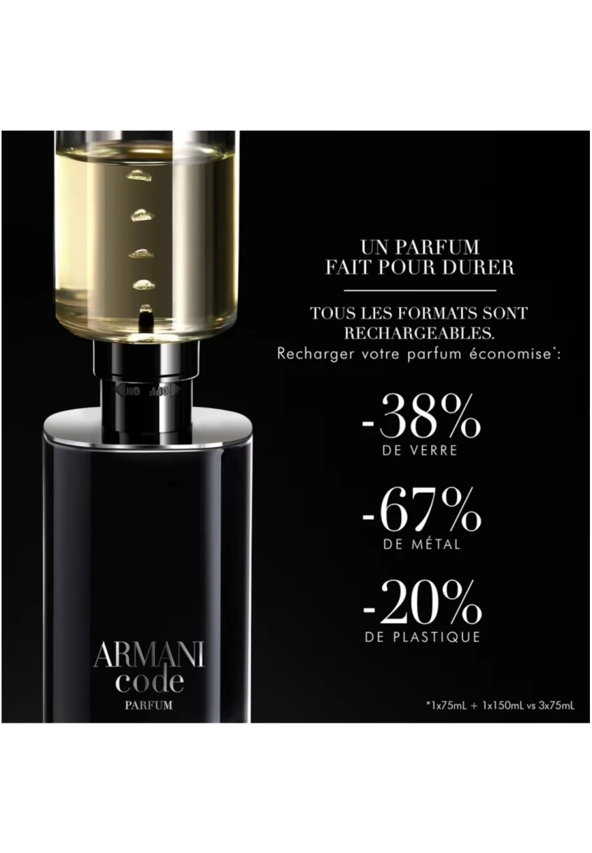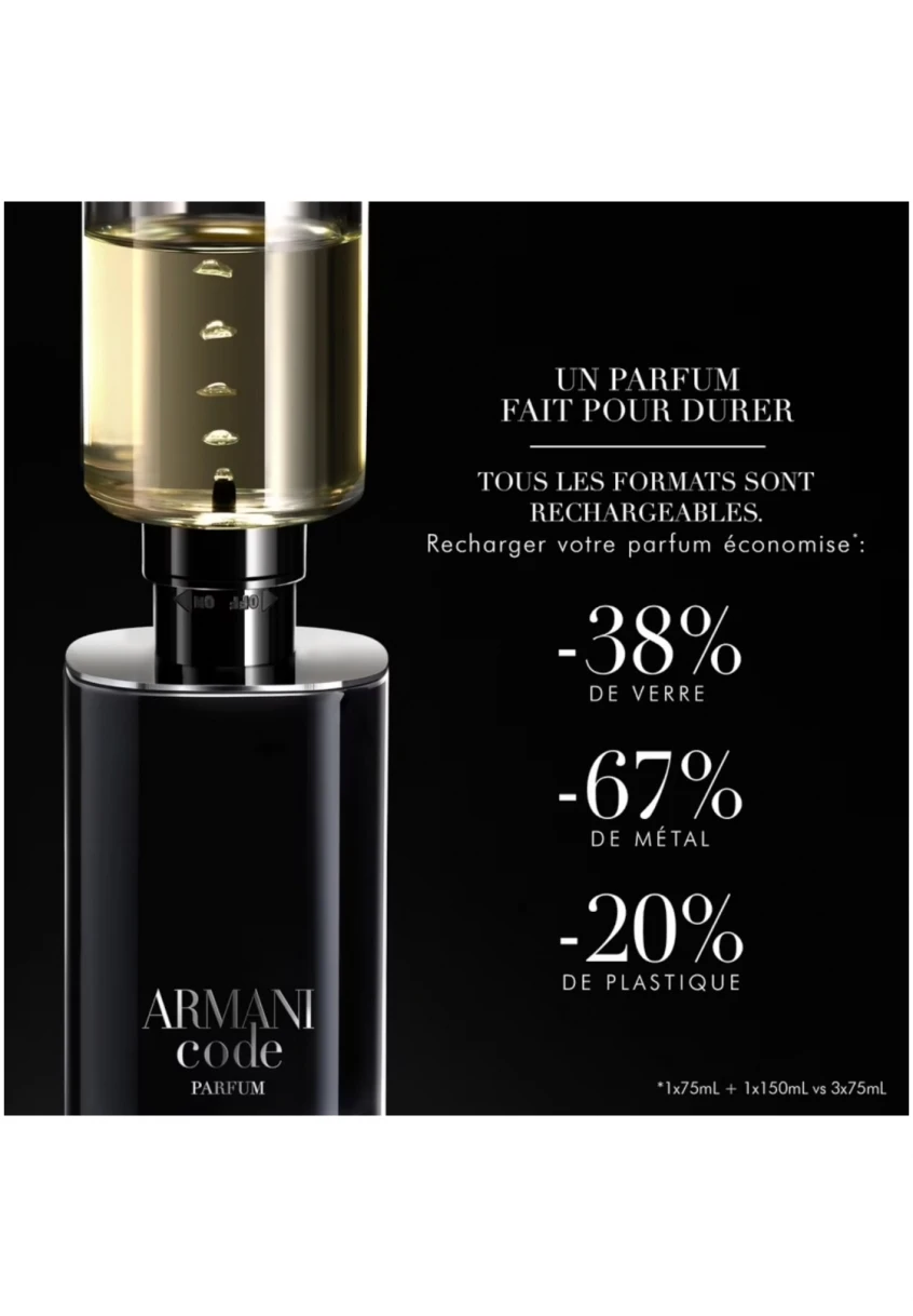 En phase avec les engagements continus de Giorgio Armani en matière de développement durable, le flacon ARMANI CODE PARFUM, éco-conçu, est rechargeable sur tous les formats grâce à la recharge 150ml.