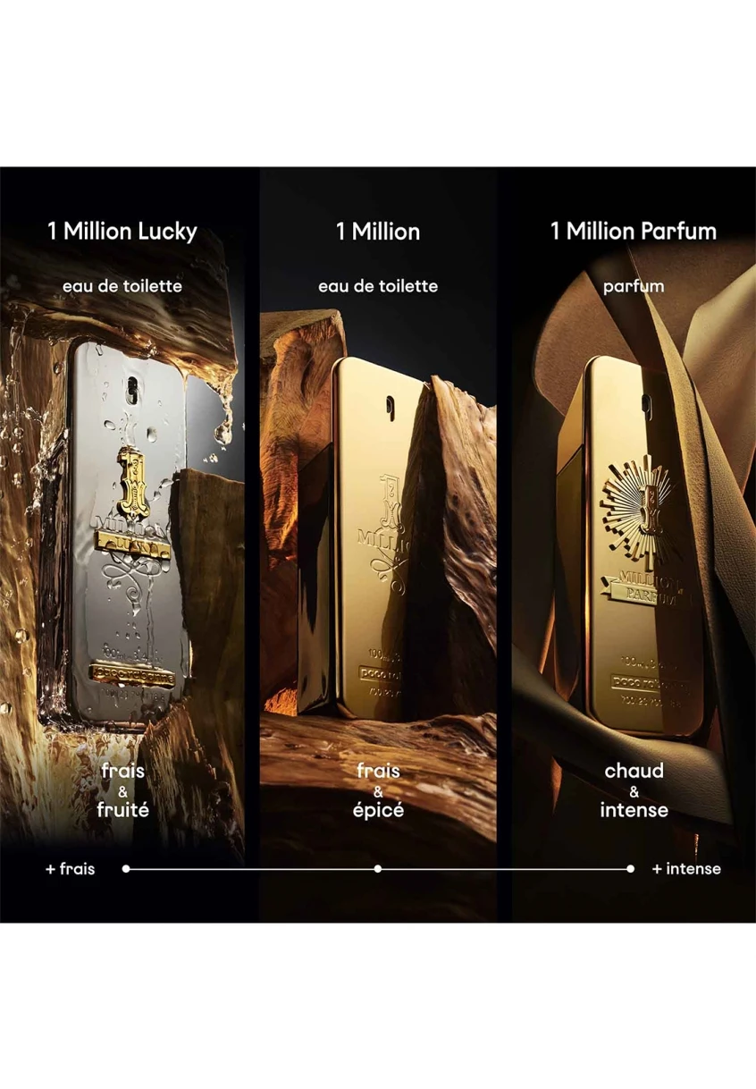 Être excessif avec style. Exagerer. Juste un peu. Faire toujours preuve d’insolence : avoir l’audace d’être too much. 1 MILLION Parfum. Une fragrance cuir solaire aux effets sales, chaud sur la peau. Un lingot addict à l’or. Un parfum pour homme puissant. Deliberement flambeur.