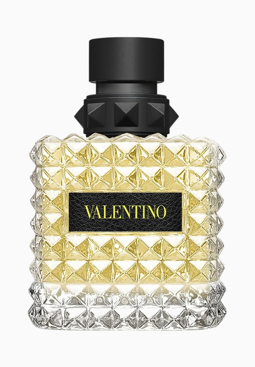 Le flacon reprend l’iconique clou Valentino : inspirée de l’architecture romaine, cette forme pyramidale donne au flacon son côté moderne. Le verre multi-facette est dynamisé par une signature jaune fluo.