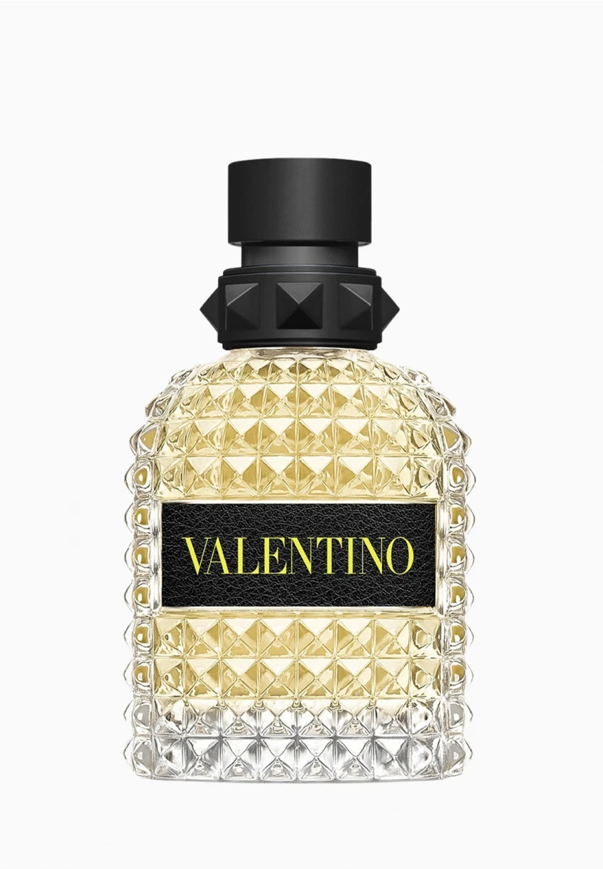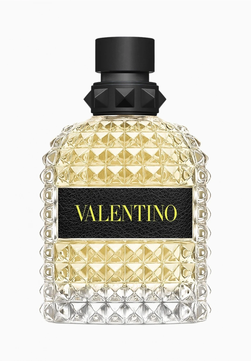Le flacon reprend l’iconique clou Valentino : inspirée de l’architecture romaine, cette forme pyramidale donne au flacon son côté moderne. Le verre multi-facette est dynamisé par une signature jaune fluo.